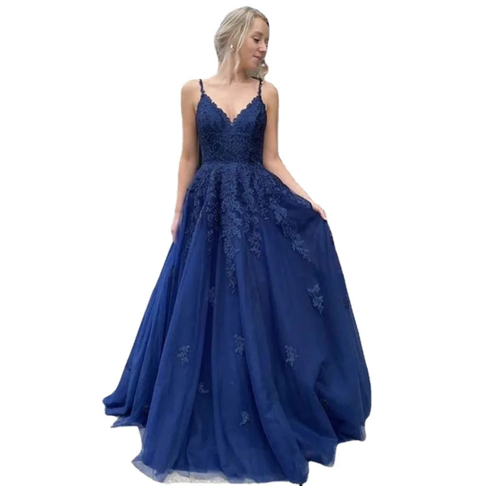 Customized Navy Blue V-neck Vestido De Fiesta Noche Prom Party Evening Dresses Robe De Soiree Gown Frock Long Soft Tulle Lace-up